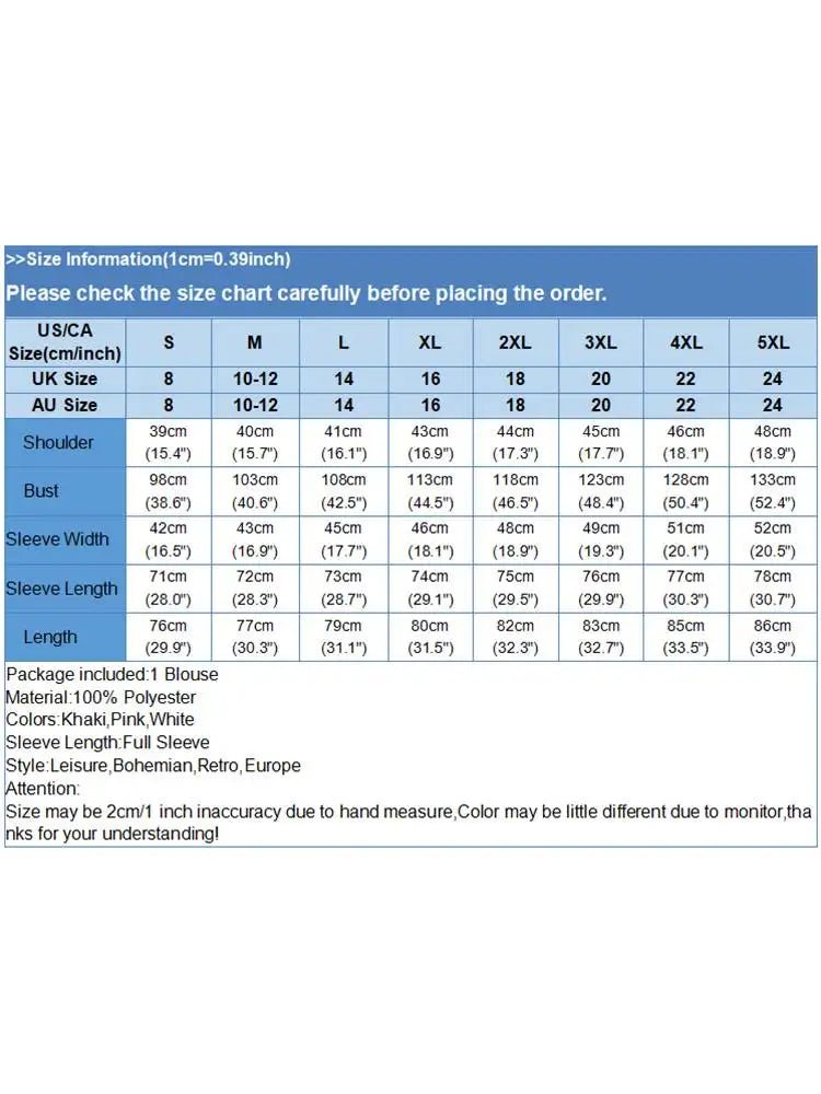 | Package included:1 Blouse Material:100% Polyester Colors:Khaki,Pink,White Sleeve Length:Full Sleeve Neckline:Turn-Down-Collar Pattern:Solid Color Buckle chain:Button Down Front,Button Cuffs Thickness:Thin Decoration:Front Pockets Style:Leisure,Bohemian,Retro,Europe Season:Spring,Autumn,Winter Occasion:Family,Party,Beach,Wedding,Holiday,Employment Label: Yes Attentions: 1.The Real Object May Exist Slightly Colors Differences Compared To Images As Different Computers Display.Caution If Minding,Thanks. 2.There Might Be A Manual Measuring 1-3 cm Error.Sorry For Any Inconvenience. 3.Please Prevail On Real Item, Model Images For Reference Only. 4.Attention!!!Please check the size chart carefully before placing the order. |